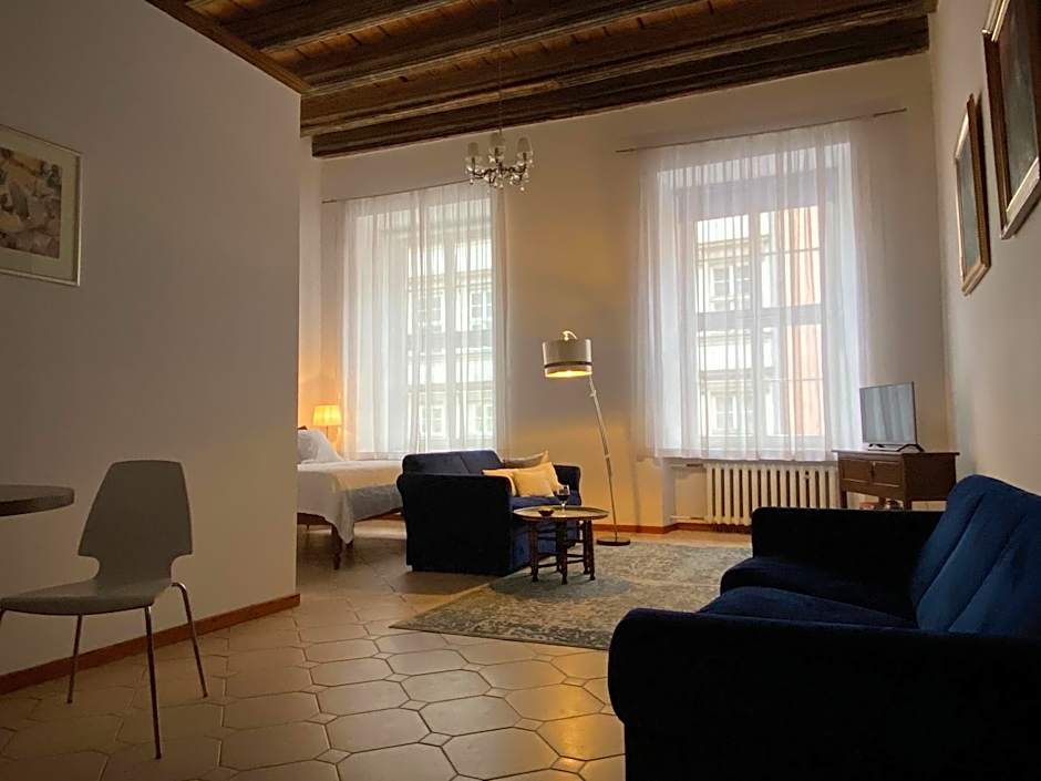 A spacious apartment that is 15 feet high, furnished with a king bed and a sofa. Features an original 300-year old wooden ceiling. It comes with a spacious seating area and embroidered bed sheets. There is also a kitchenette with a small dining corner. A free tea/coffee making set is offered. There is a window which can be opened to let fresh air inside.