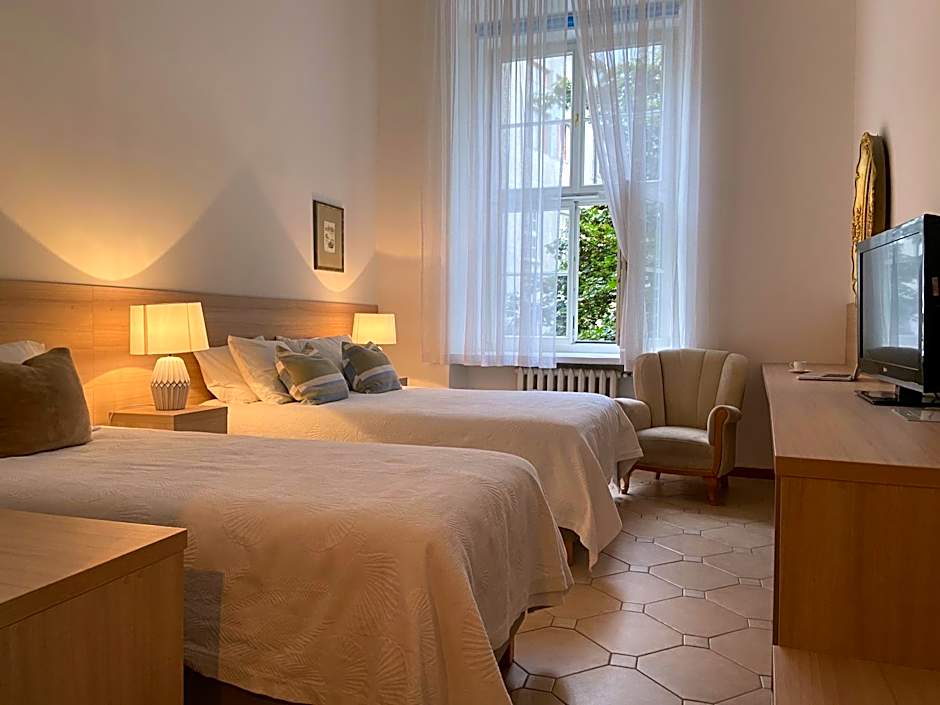 A spacious, 15 foot high room, that comes with a small seating area, furnished with a queen and a single bed. A free tea&coffee making set is offered. The bathroom is equipped with a shower, towels, a hairdryer and free toiletries. There is a window which can be opened to let fresh air inside.